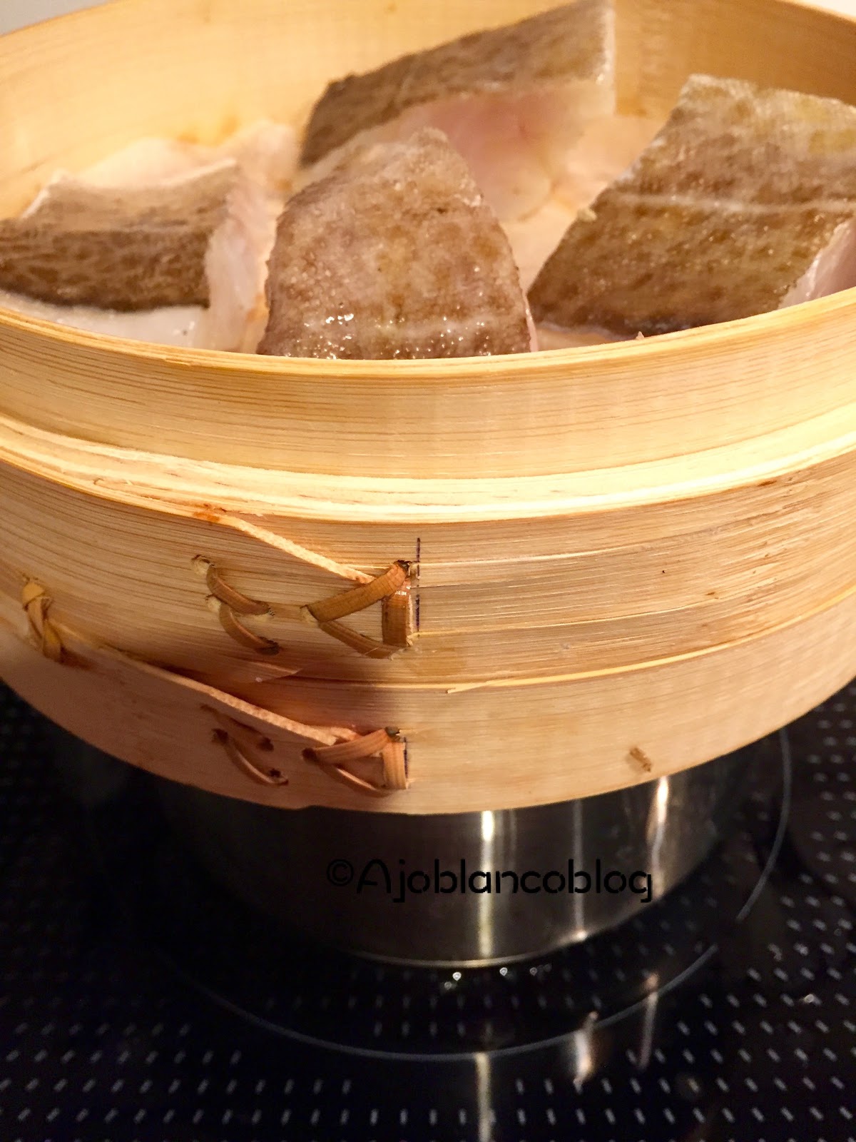 El bacalao lo salpimentamos y lo regamos con un poco de zumo de naranja (Ching habla de zumo de piña)y lo colocamos en la cesta de bambú. Lo dejamos hacer el vapor. Unos 7 / 8 minutos y reservamos.